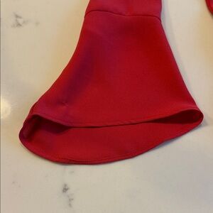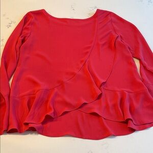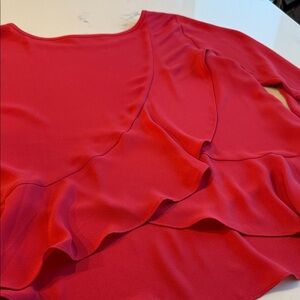 Elegant red blouse with bell sleeves and ruffle cross asymmetrical back. Perfect for versatile styling! I absolutely love this top! Wear it to a ballgame with jeans or dress it up for a night out with leather leggings. Extremely versatile!