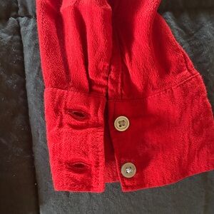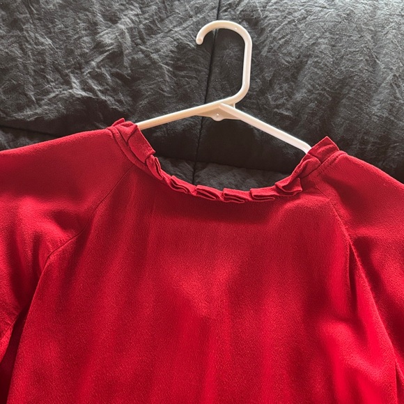 Elegant red blouse with ruffle neckline. Perfect for any occasion.