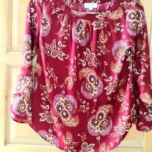 This elegant maroon blouse by LOFT showcases a relaxed fit with delightful ruffled accents, offering a chic and comfortable style. Its airy design makes it a versatile addition to any wardrobe, suitable for both casual and sophisticated settings.