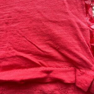 LOFT brand red sequin tee with zipper detail on back. Red color has a slight pink tinge, has hot pink vibes.