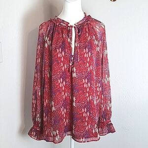 LOFT Red Sheer Blouse, Blue & White Print, Ruffled Collar & Cuffs, Size XL