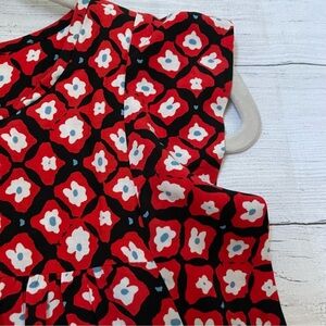 Chic red dress with black and white floral design. Features a stylish tie-front detail. Size Medium