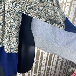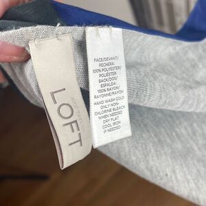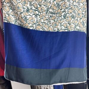 LOFT Reversible Floral Print / Grey Jersey Scarf. Double sided scarf has one side that features silky polyester green/tan/cream floral print with navy blue/black color blocked end stripes and the other side is solid gray rayon jersey fabric. Tags are lightly stitched on and meant to be removed. Gently worn and clean with no flaws to note.