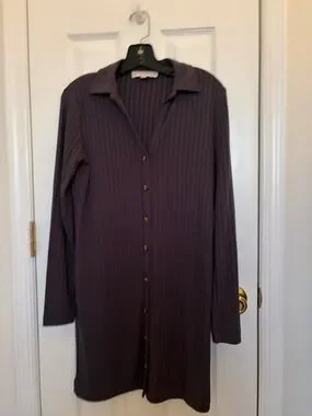 Long-sleeve ribbed dress with button-front closure. Collared neckline. Straight, relaxed silhouette. Lightweight knit fabric.