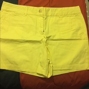 6” inseam in dusty lemon color. Button & zip closure.