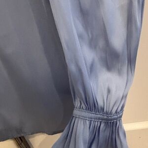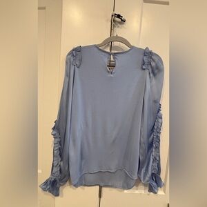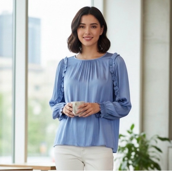 Chic periwinkle blue blouse with ruffle details. Soft fabric. Perfect for casual or dressy occasions.