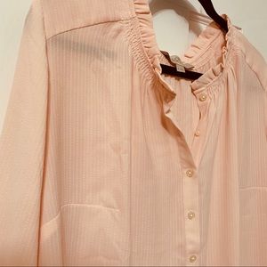 Comfortable, flowy, blouse. Small ruffles at collar add a feminine touch to the already beautiful blush pink. Worn tucked in a bit at the front and loose in the back. Looks great with trousers or jeans. Or as a tunic with leggings. Excellent condition. Worn only a few times.