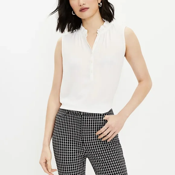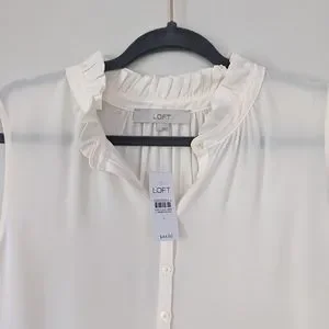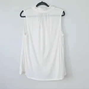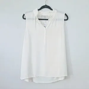 This classic mixed media shell features a ruffle collar for a little extra special touch. I own these is many colors they go with everything and they also pair great layered under sweaters in colder weather. It's a closet staple for all seasons! Color is deep whisper white, which is cream. This color is slightly sheer.