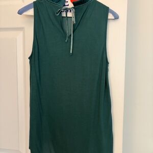 LOFT sleeveless shell with ruffled neck, single button neck. Mixed media--front is rayon, back is cotton. Stylish and comfortable! Color is light teal. Looks great alone or under a jacket or suit jacket. smoke free home.