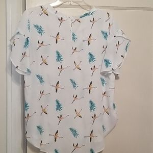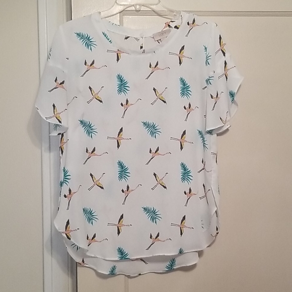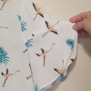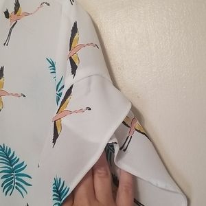 Cute ruffle sleeve top with flamingos and palm leaf design. Side slits and button closure in back. Made of 100% polyester.