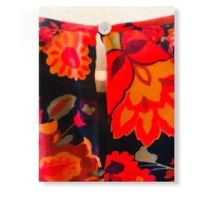 Black and orange fall colors. Back button keyhole and round neck. The blouse is lined. Romantic ruffle trim.