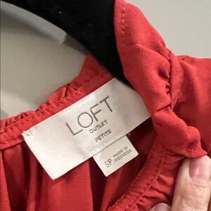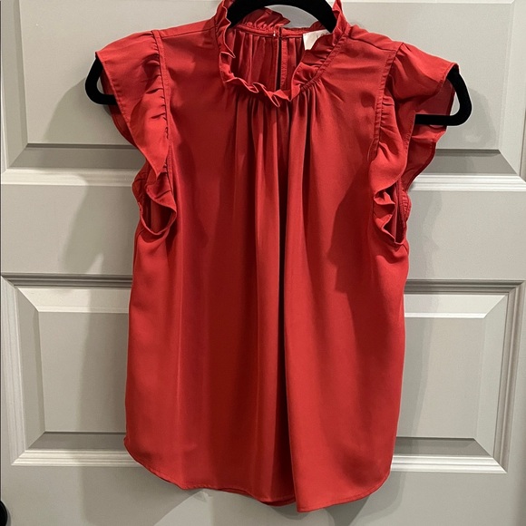 Chic blouse with ruffled sleeves. Color is a gorgeous muted red orange. Great for spring