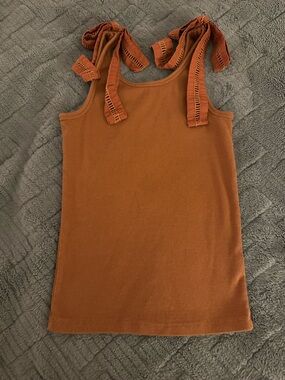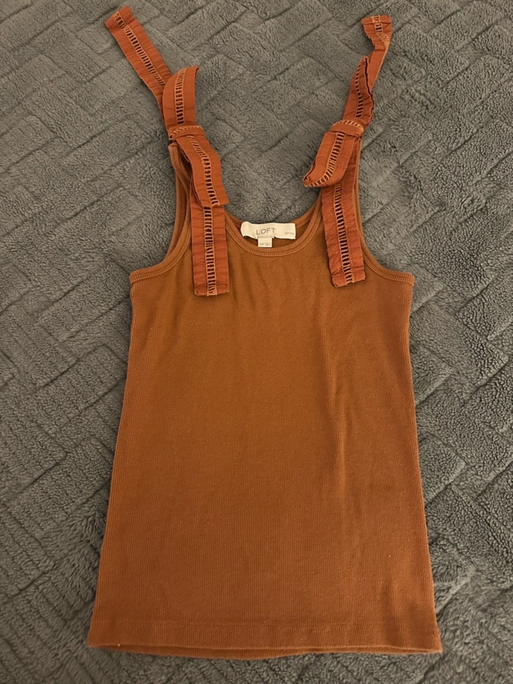 LOFT tank top in a warm rust shade. Ribbed knit fabric for a close, comfortable fit. Decorative tie straps add feminine detail. Easy to pair with casual or dressed-up looks.