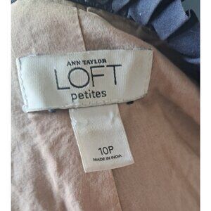 Navy blue rustic-style light jacket from Ann Taylor. Eyelet and pin tuck details on arms and bodice. Fully lined.