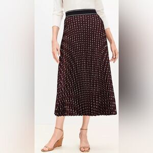 LOFT S Burgundy White Red Gold Bow Print Pleated Midi Skirt