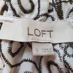 LOFT SZ S Embroidered Pattern Olive/Taupe & White 100% Cotton Short Sleeve Top
