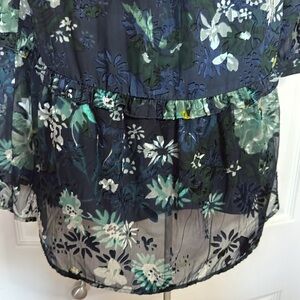 Chic sheer dress with a blend of blue and green. Sewn in navy satin lining
