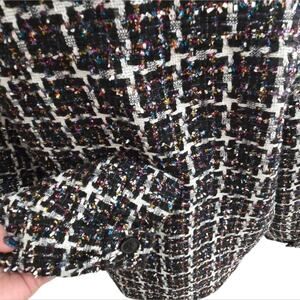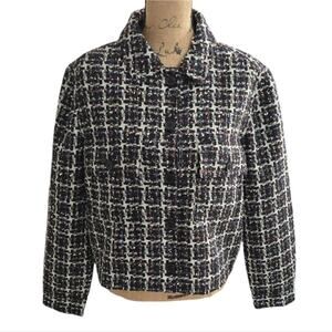 Elevate your style with this stunning tweed jacket, a masterpiece of texture and shimmer. Feel the exquisite woven fabric embrace you, catching the light with subtle, playful flecks of color that add a touch of magic to the classic black and white grid pattern. Designed for a sophisticated yet modern silhouette, its cropped length creates a flattering profile, perfect for accentuating your favorite high-waisted bottoms. The polished button front closure and crisp collar lend an air of timeless elegance, while the intricate weave promises a luxurious feel and exceptional durability. This jacket is your go-to piece for transitioning from a chic office ensemble to a dazzling evening out, or for adding a touch of glamour to a casual brunch.