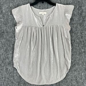 LOFT Women's S Gray Metallic Blouse with Velvet Flutter Sleeves. A chic and elegant top, perfect for formal occasions or a stylish evening look. The shimmering fabric adds a touch of sophistication.