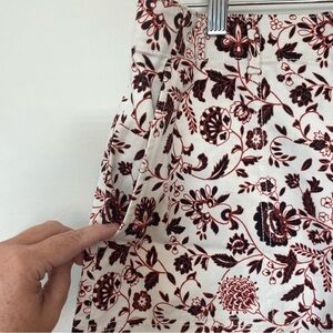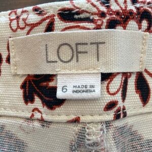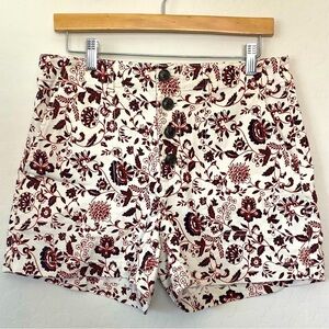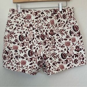 LOFT shorts with a 4 front button fly in Womens size 6. Side pockets and 2 back pockets. These shorts are perfect for casual to dressed up. The floral print has reddish maroon and black colors on a white background.