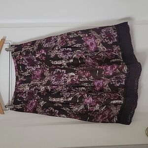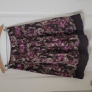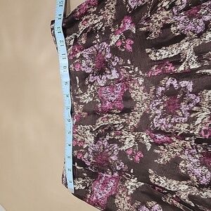 LOFT Size 2 Floral Pleated Linen/Silk Blend Midi Skirt. EUC. Excellent Used Condition, No Holes, Rips, Stains or Snags. Gorgeous Browns and Pinks with a Brown Crochet Lace Trim at Hem. Lined. Side Zipper with Hook and Eye Closure. Please refer to measurements in photos to ensure proper fit.