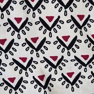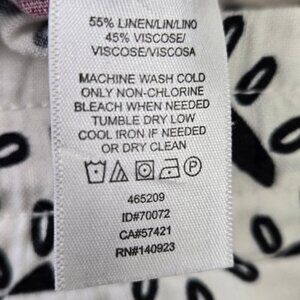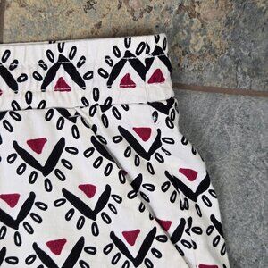 Linen blend shorts have an white background with a black and red pattern all over. Elastic waistband has a drawstring tie on the front. Two slant pockets on the front.
