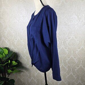 Navy blue button down shirt has a round neck. Chest pocket on left side. Rounded hem. Dolman long sleeves with button cuff. Shirt is tied at the bottom but can be untied and tucked in.