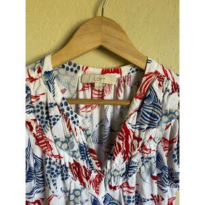 LOFT Size Small KOI Goldfish Blue White Red Rayon Shirt V-Neck