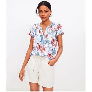 LOFT Size Small KOI Goldfish Blue White Red Rayon Shirt V-Neck Fish Angelfish Nautical Flutter Sleeve Ruched