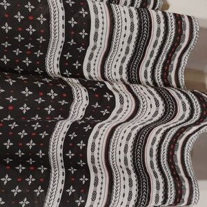 Gorgeous skirt by LOFT Ann Taylor. Extremely flowy lightweight with underneath layer in black. the top of skirt is stretch it pulls nicely for extra room tightens with black rope ties with tassels on ends and silver wraps. just that is so pretty. has ruffle top. black with little white designs then a small ruffle then white stripes with black designs and some tiny red dots added. As you go for. it gets more designs. Absolutely beautiful skirt. go great from summer to fall with boots.states size XXS But I believe it could go todefinitely a regular Small. measurements are approximately lying flat waist unstretched 14" stretches up to 17". length from top to bottom 33". new without tags. gorgeous