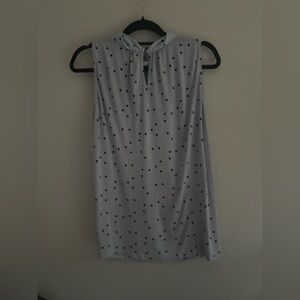Chic LOFT sleeveless blouse featuring a stylish mix of fabrics. The front is made of a silky, flowy material, while the back is crafted from a soft, stretchy knit fabric for extra comfort. Light blue with classic black polka dots.