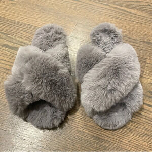LOFT Slipper Sandals Faux Fur Twist gray Casual Neutral Cozy Soft Slides