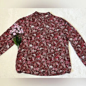Pretty LOFT branded long sleeve blouse in multi pink color, paisley and floral all-over pattern, high smocked neckline, smocked cuffs, elastic waistband, lightweight sheer like material, flowy fit, double button keyhole back.