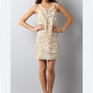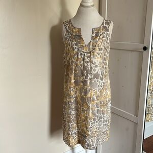 This LOFT linen mini dress is new with tags. It is a feminine dress in a muted palate of cream, yellow, and gray. It has an soft abstract pattern, and a zip closure. It is lined.
