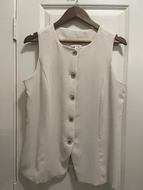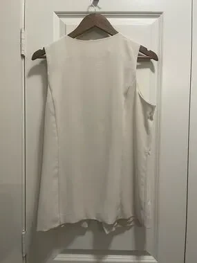 Lightweight sleeveless shell with a rounded neckline. Front button closure with subtle matching buttons. Smooth, flowing fabric for layered looks. Fully lined NWOT