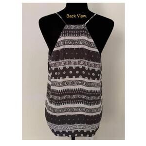 Very sweet spaghetti strap top. Would look so cute under a cardigan or any other layered situation. But also... great on its own. Pretty purple and gray hues in the pattern. Fully lined with a sheer material. Excellent condition.