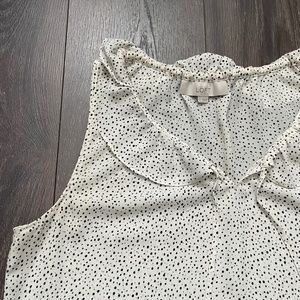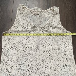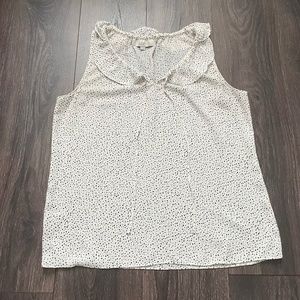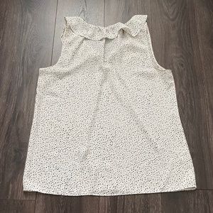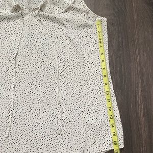 White sleeveless top with black speckles. Ruffled collar line and string ties. Can be worn tied or untied.