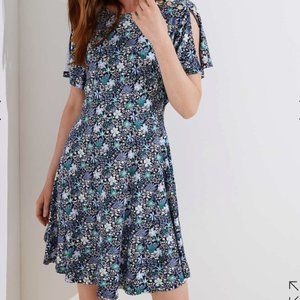LOFT navy floral dress with split flutter/dolman style sleeves and gold button detail at shoulders.