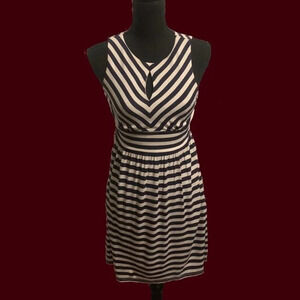 Ann Taylor LOFT navy blue and white striped mini dress. Sleeveless, keyhole neckline, and keyhole button back detail. Paneled waist, gathered skirt.