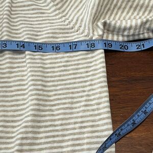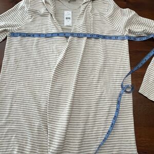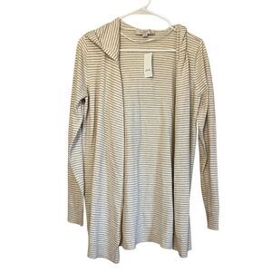 This is a brand new with tags LOFT hooded cardigan sweater in a classic beige and white stripe pattern. The open-front design makes it perfect for layering over any outfit, offering a relaxed yet stylish look. Its lightweight knit construction provides comfortable wear for transitional weather or adding a touch of warmth indoors.