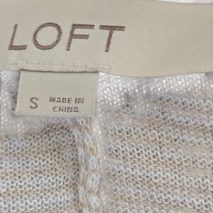 Keywords: LOFT cardigan, kimono style, open front, short sleeve, lightweight knit, striped pattern, beige tan, casual layering, boho chic, resort wear, everyday essential, summer knit