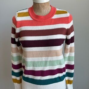 Soft and understated with a brilliant pop of colorful stripes, this sweater is an effortless way to brighten any weekend look. Round neck. Long sleeves.