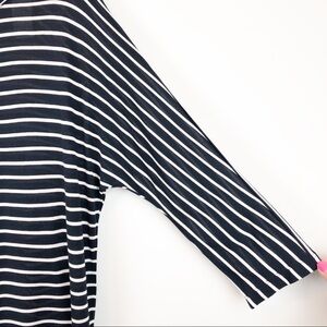 Dolman sleeves softens this striped top giving it a modern factor. Round neckline, 3/4 sleeves, navy blue and white stripes. Lightweight rayon fabric.