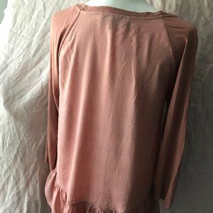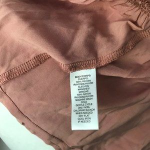 Super soft and drapey fabric, rich deep blush / rosy clay color. Bodice and ruffle are standard rayon weave fabric, 3/4 sleeves are a rayon jersey knit.
