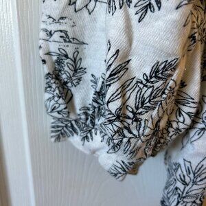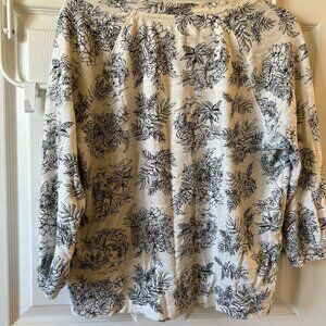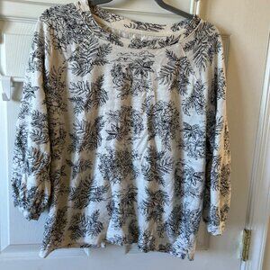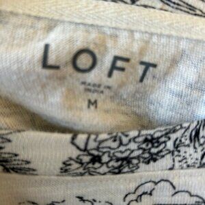This 3/4 sleeve sweatshirt material top is perfect to sneak a sweatshirt day in at the office - the print is tropical animal theme, but not animal print, there is the tiniest pouf at the sleeve hem, and just enough detail to not be accused of wearing a sweatshirt with the feel of your favorite crew neck! LOFT M - washer & dryer safe!