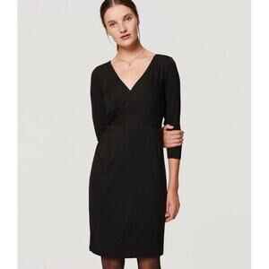 LOFT by ANN TAYLOR black wrap surplice Neckline 3/4 sleeve v-neck stretch knee length cocktail, career, work dress, with an invisible zipper in the back