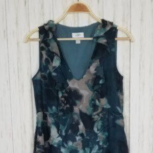 Lovely Ann Taylor Loft sleeveless shift dress in a teal, gray, tan, cream & blue print. V-neck. Ruffles around the neckline continue down the front center to the waist. Two pockets on the sides of the hip. Side zipper. Fully lined.