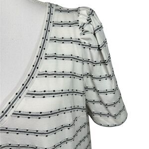 Stylish white dress with black stripes. Features a V-neck and short sleeves.