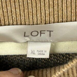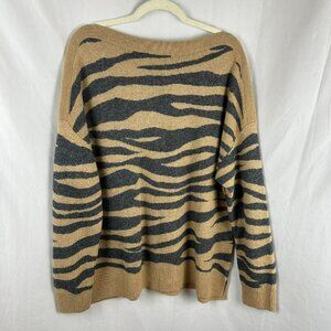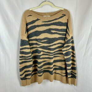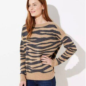 This cozy LOFT sweater features a stylish tiger stripe design in brown and gray. Crafted from a warm wool blend, it offers a boat neck and long sleeves, perfect for chilly days. Ideal for adding a touch of wild elegance to any wardrobe.