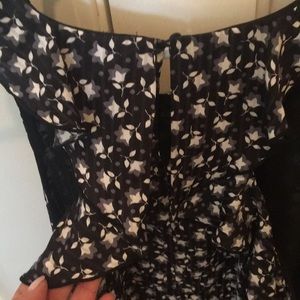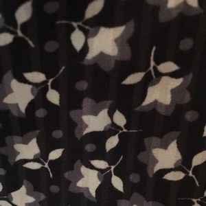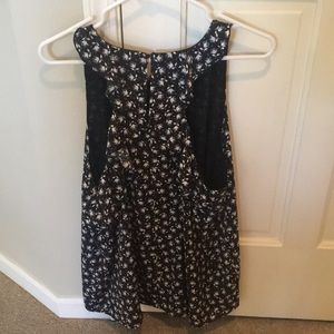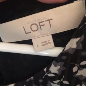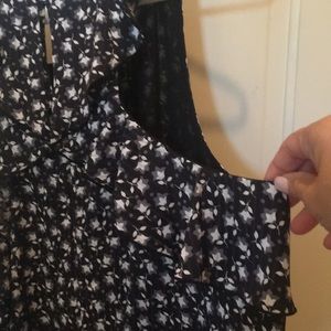 AnnTaylorLoft feminine racer back shell, size L. Button at neckline in back with ruffle detail from neckline to sleeve opening, lined. Black, gray and white floral print. 100% polyester, machine wash cold and tumble dry low. May dry clean. Excellent condition!